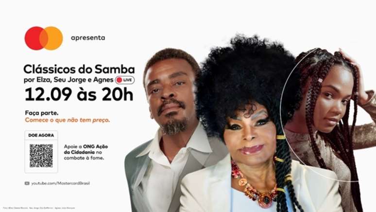 No dia 12 de setembro, sábado, às 20h, a Mastercard promove mais um encontro inédito entre ícones da música brasileira. Desta vez, a jovem Agnes Nunes e o consagrado Seu Jorge se unem à lendária Elza Soares para cantar sucessos do samba brasileiro. O evento marca o retorno da "Voz do Milênio" cantando o gênero musical mais brasileiro de todos, após hiato de décadas em show ao vivo. A live será transmitida no canal do YouTube da Mastercard, no Multishow e nos canais dos artistas.