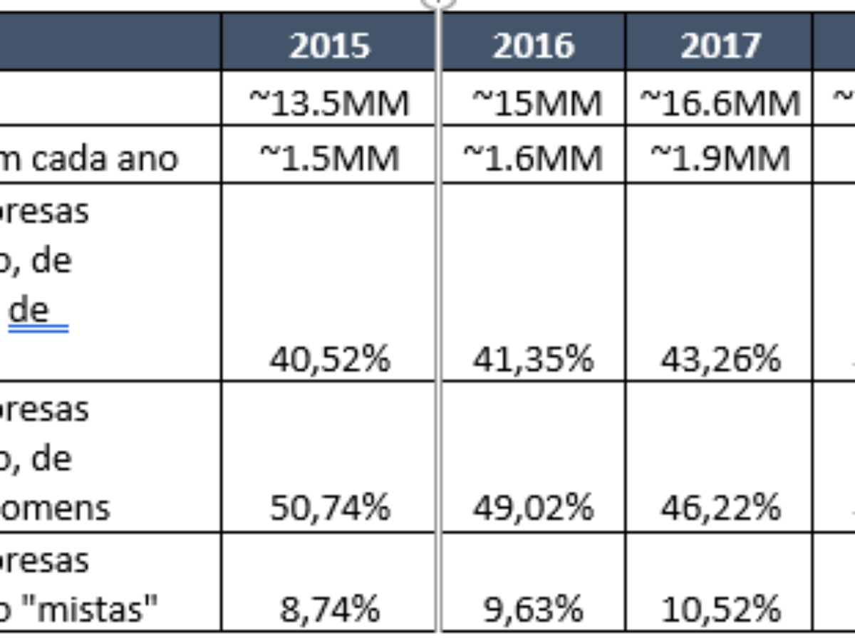"O dado indica que as mulheres estão ampliando a sua participação no mercado. Em 2015, apenas 40,52% das novas empresas criadas tinham apenas mulheres como sócias, quase sete pontos percentuais a menos do que encontramos na safra das empresas criadas em 2019", afirma Thoran Rodrigues, CEO e fundador da BigDataCorp. Essa mudança aponta para uma economia que está caminhando para refletir melhor a participação demográfica das mulheres na sociedade brasileira, de 51,7%, de acordo com dados Pesquisa Nacional por Amostra de Domicílios Contínua (PNAD Contínua) de 2018.