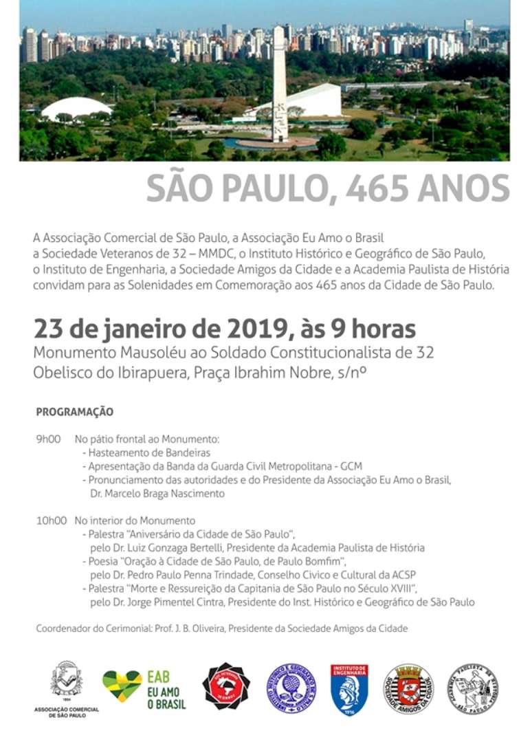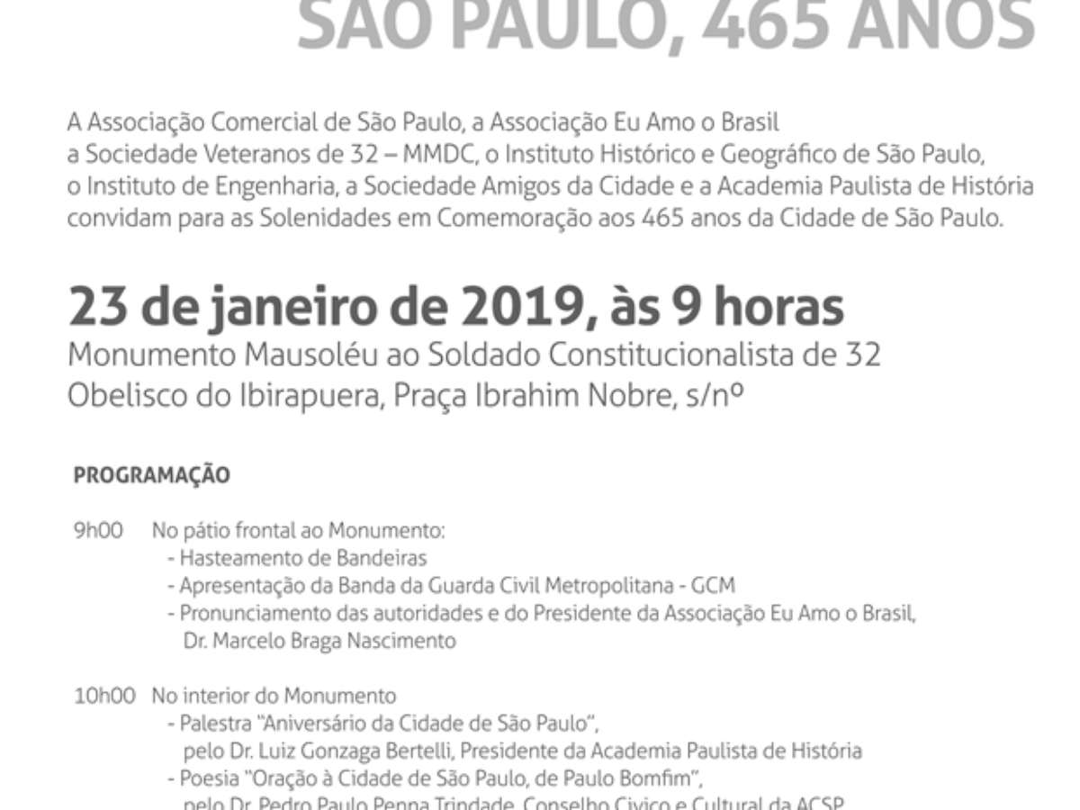 A Associação Eu Amo o Brasil (EAB), sem fins lucrativos, cujo objetivo é contribuir com o desenvolvimento da educação para a cidadania e a consciência cívica dos brasileiros, vai presentear a cidade de São Paulo com 36 bandeiras, sendo 17 do Brasil, 17 do estado, uma do município e outra dos heróis da Revolução Constitucionalista de 1932. Elas serão hasteadas no dia 23 de janeiro, às 9h, ao redor do Obelisco do Ibirapuera.