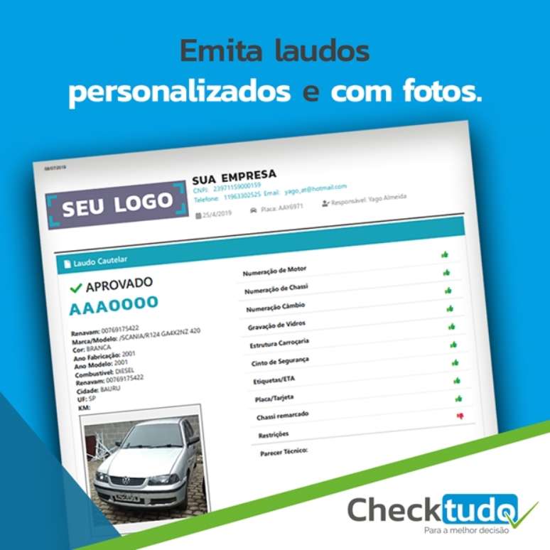 Com a crescente demanda de informações cada vez mais precisas e com o aumento do conhecimento das pessoas físicas perante as informações que devem ser validadas na compra de um veículo, a empresa Checktudo oferece ao seu cliente uma ferramenta para emissão de laudos veiculares totalmente personalizáveis.