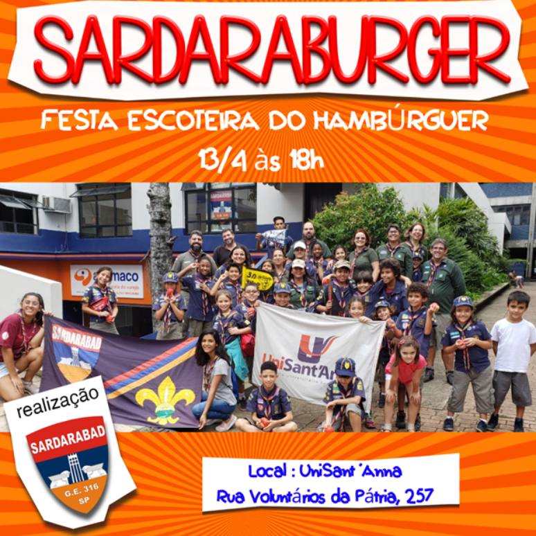 O Grupo Sardarabad convida toda a comunidade a vir experimentar o saboroso sanduba Armênio, fazer nova amizades e conhecer as atividades escoteiras. Todas informações do evento e do Grupo, estão atualizadas na página do grupo no Facebook - @escoteirosardarabad.