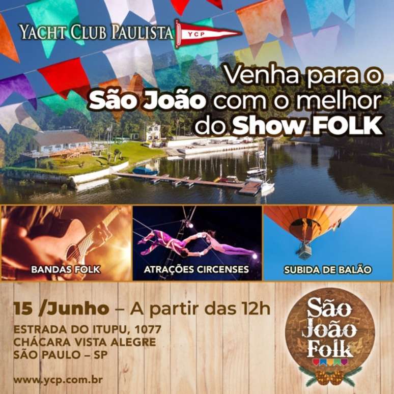 Um dos mais tradicionais arraiais da zona sul de São Paulo e considerado um dos eventos mais esperados do ano, a festa junina do Yacht Club Paulista inova no formato e apresenta o SÃO JOÃO FOLK - um festival junino de FOLK MUSIC!