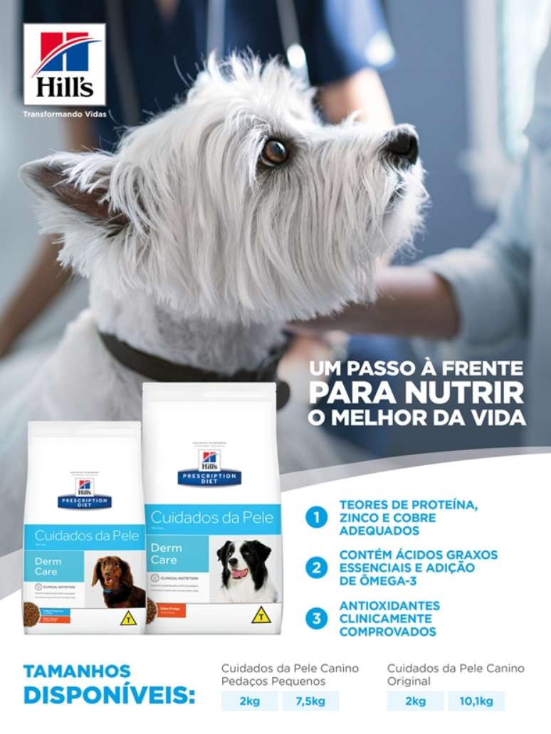 Combinar cuidados com a pele, como higiene constante, e uma dieta balanceada ajuda a manter o animal mais saudável. Por isso, a Hills Pet Nutrition desenvolveu a Hill's Prescription Diet Cuidados da Pele Cão. Fabricado no Brasil, o alimento combina teores adequados de proteína, zinco e cobre com ácidos graxos essenciais, ômega 3 e antioxidantes clinicamente comprovados.