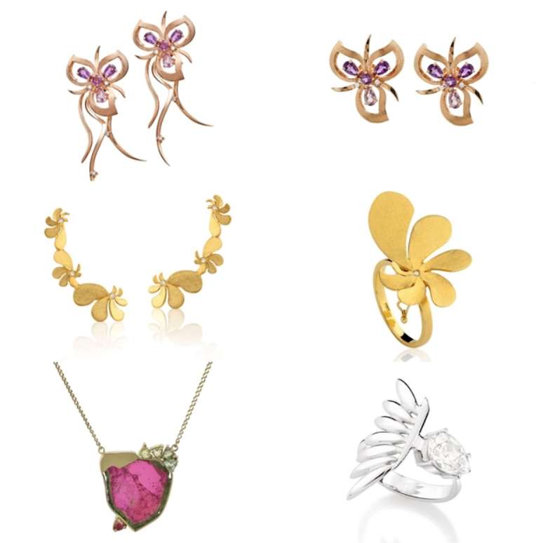 A Del Lima traz a essência feminina nas joias florais, que se transformam e podem ser usadas de variadas formas. As designers da marca, Ali Pastorini e Dione Lima, tiram o máximo efeito dos diversos tons e texturas do ouro, e as cores fortes multicolorido de pedras preciosas, como a ametista.