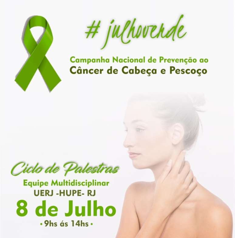 Em apoio ao Julho Verde, os especialistas que trabalham no atendimento pelo SUS do HUPE, vão dar aulas e depois tirar dúvidas sobre: cirurgia de cabeça e pescoço, fonoaudiologia, nutrição, enfermagem, assistência social, psicologia, odontologia e fisioterapia. "Do ponto de vista da saúde pública, quanto menos casos por meio da prevenção e descoberta precoce, menos custo e melhor o tratamento para o paciente", afirma o cirurgião de cabeça e pescoço, Leonardo Rangel, médico, professor e pesquisador da Universidade Estadual do Rio de Janeiro, que coordena o evento. Os profissionais também vão orientar de forma prática, como por exemplo sobre a atenção à saúde bucal, desde perceber os sintomas até os cuidados às pessoas que já estão com o câncer; e como pacientes laringectomizados podem ter melhor qualidade de vida. A doença começa com sinais como manchas brancas na boca, feridas que não melhoram, mudanças na voz e rouquidão persistente, lesões de pele (melanoma), dificuldade para engolir e pode demorar a ser descoberta. Cerca de 70% dos pacientes procuram ajuda em estágio de câncer avançado, o que requer um tratamento complexo que pode exigir quimioterapia, radioterapia e cirurgia. Além disso, pode provocar deformidades físicas e problemas psicossociais.