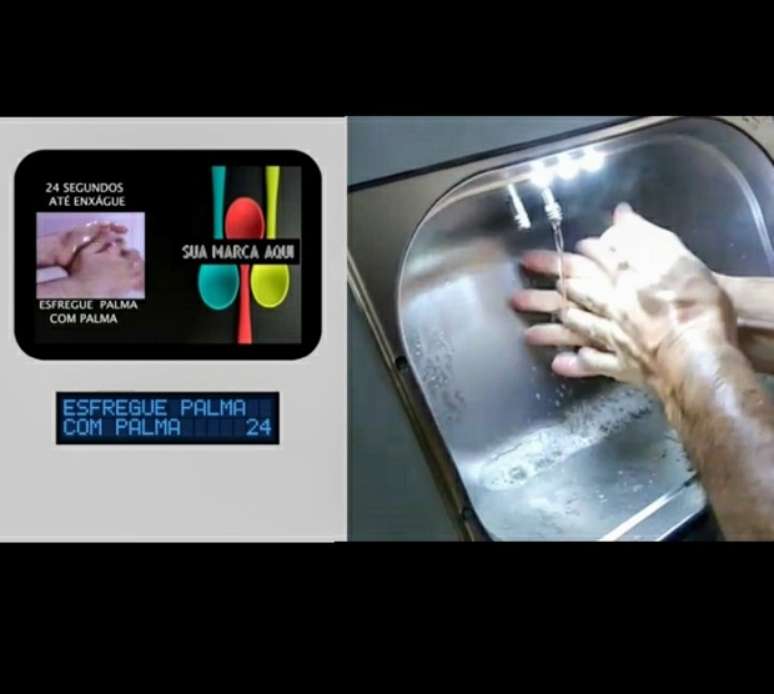 Depois da liberação do sabonete não será possível enxaguar as mãos, pois a máquina não liberará a água, deixando o sabonete agir e possibilitando a esfregação das mãos, conforme instruções do vídeo.