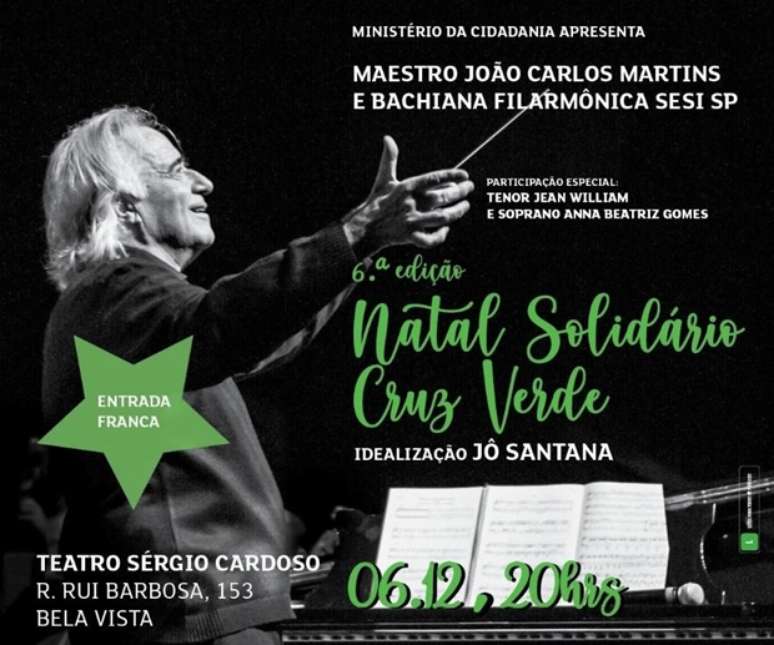 Idealizado pelo ator e produtor Jô Santana, o Natal Solidário Cruz Verde chega a sua sexta edição com a apresentação da Bachiana Filarmônica Sesi-SP, sob regência do Maestro João Carlos Martins e participações do tenor Jean William e da soprano Anna Beatriz Gomes.