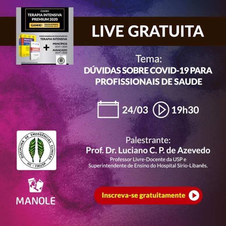 Nesta semana, a Manole Educação realizará três aulas (online com transmissão ao vivo) gratuitas para colaborar e preparar médicos, enfermeiros, auxiliares de enfermagem e profissionais de saúde mais jovens e sem tanta experiência a se aperfeiçoar em como fazer ventilação mecânica, atender os idosos e pacientes com COVID-19, nessa verdadeira "guerra" e luta contra o tempo.