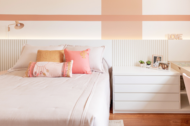 Os tons utilizados foram Saída de Praia (na parede da janela), Bala Toffee (na faixa vertical e em detalhes de marcenaria) e Mousse de Goiaba (na faixa horizontal acima da cabeceira).