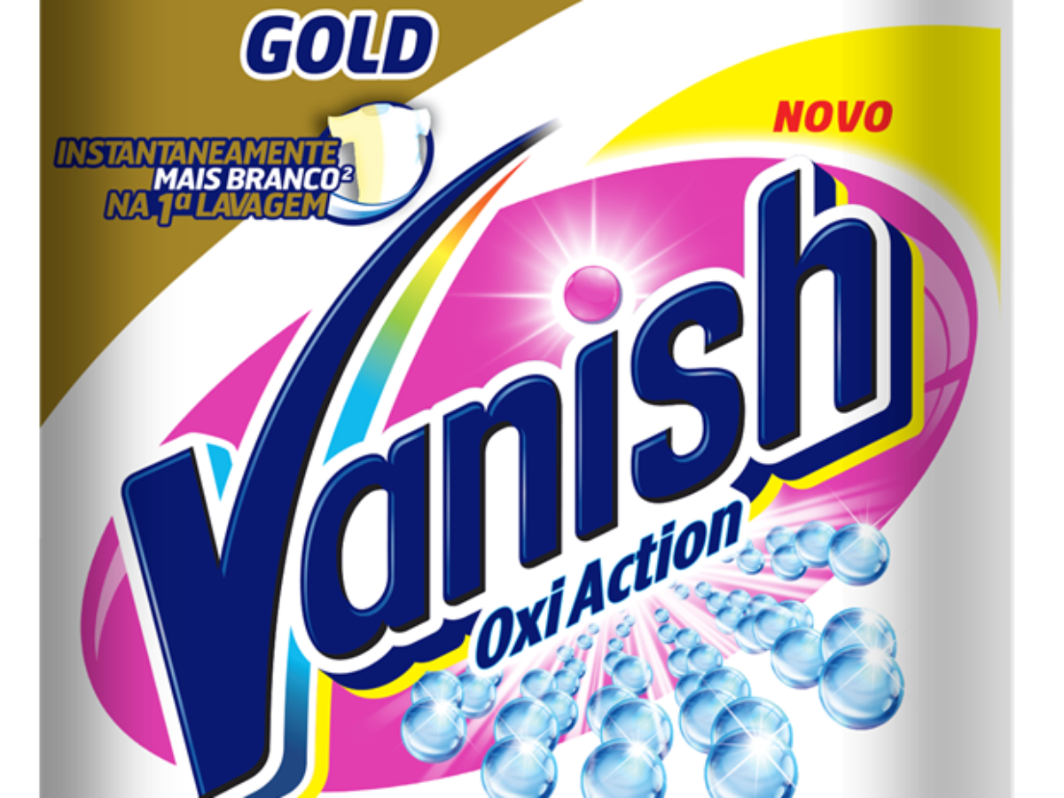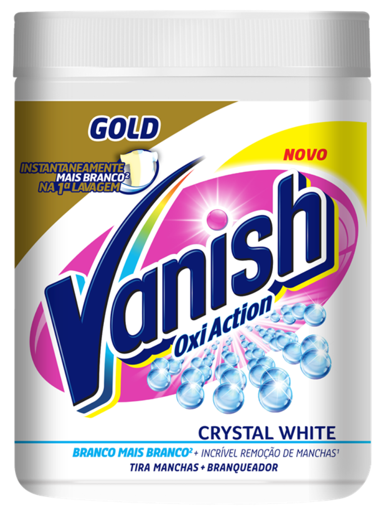 Vanish Crystal White Gold remove as difíceis manchas amareladas causadas pelo cloro e recupera o branco das roupas já na primeira lavagem.