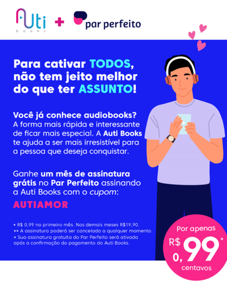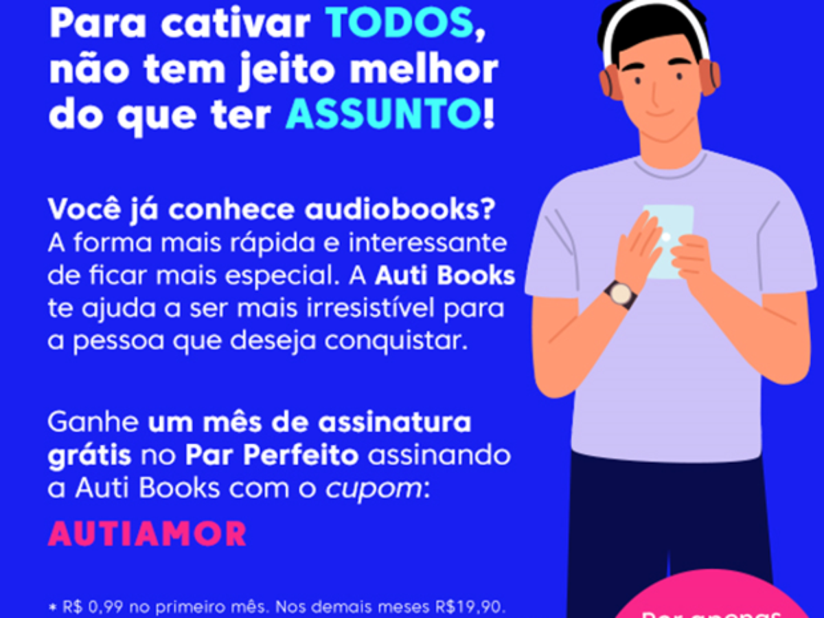 Toda vez que rola o primeiro encontro vem aquela dúvida: "Sobre o que vamos falar? Será que vou ter assunto suficiente para o jantar todo? E se não tivermos assuntos em comum?" É justamente para ampliar os temas que podem ser abordados entre o futuro casal que a Auti Books, plataforma de venda de audiobooks, e o Par Perfeito, uma das maiores plataformas de relacionamento online do Brasil, uniram forças.