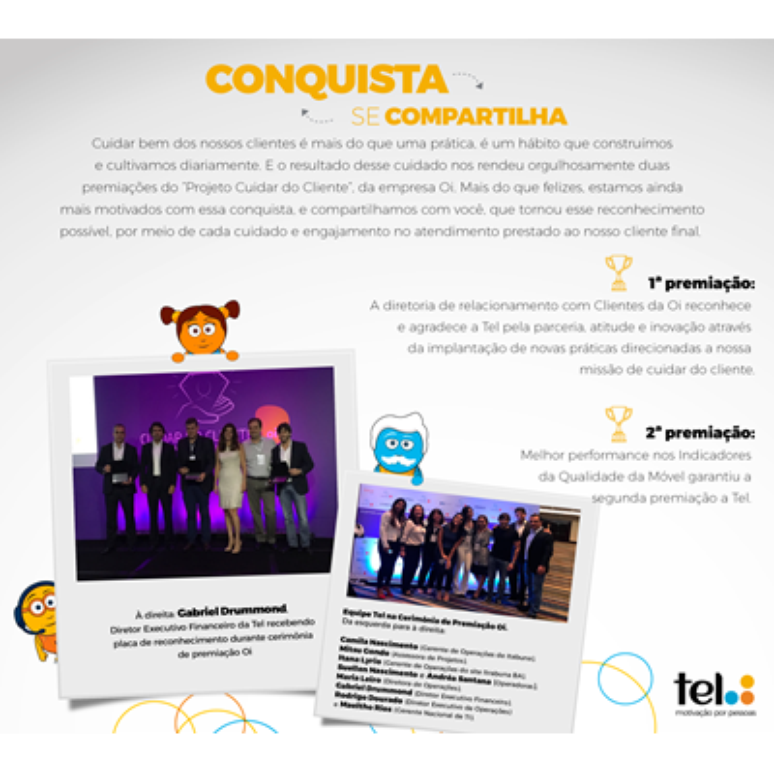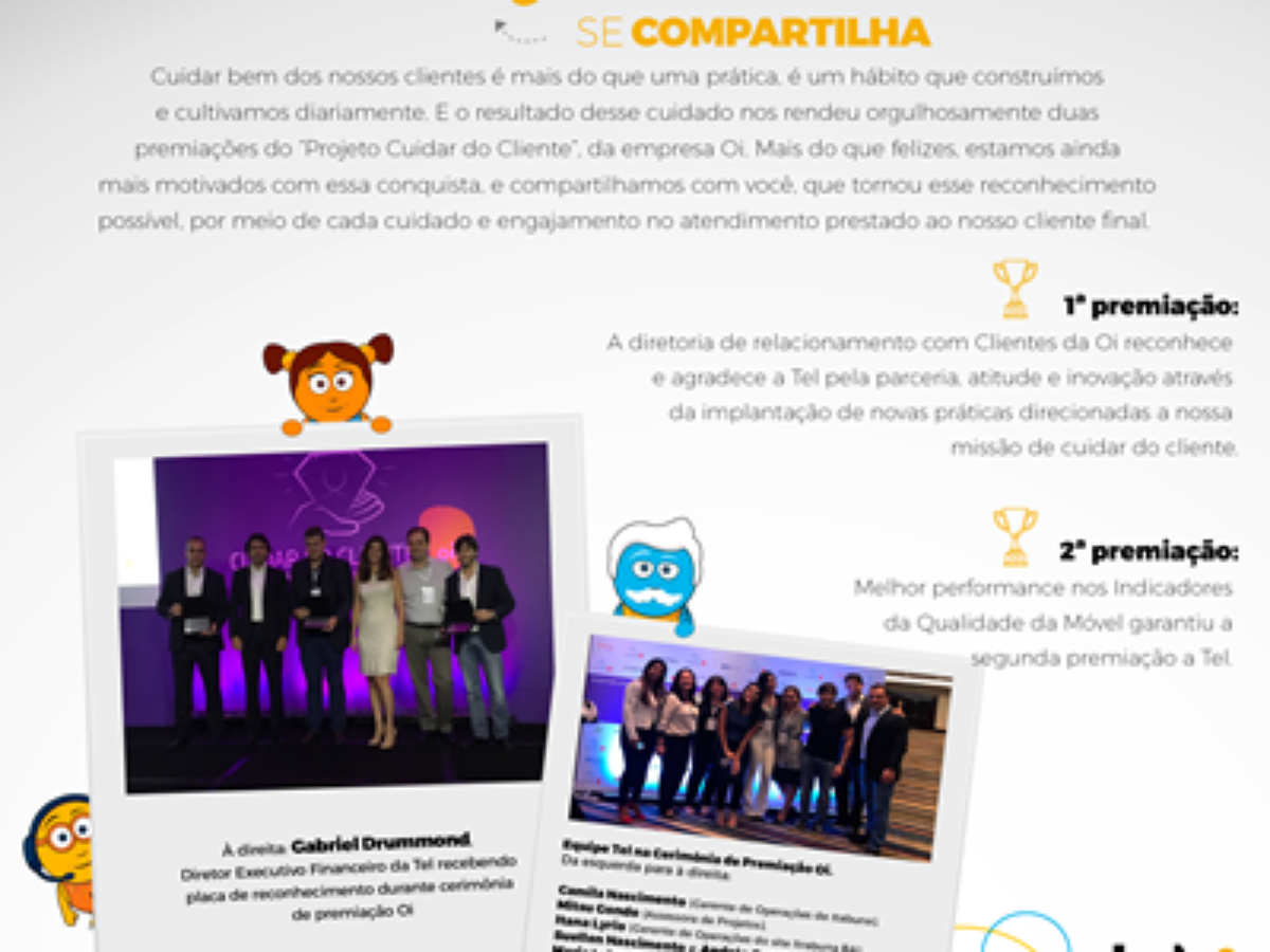 Como reconhecimento pelo trabalho iniciado em fevereiro desse ano, intitulado 'Cuidar do Cliente' - proposta do cliente Oi -, a Tel garantiu duas premiações durante a Convenção da Diretoria de Relacionamento com Clientes, nos dias 30 e 31 de março, no Rio de Janeiro, pela implantação de novas práticas direcionadas ao exercício de cuidar do cliente, além da excelente performance nos Indicadores de Qualidade Móvel.