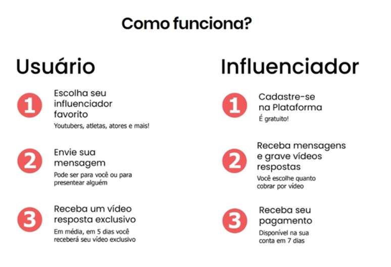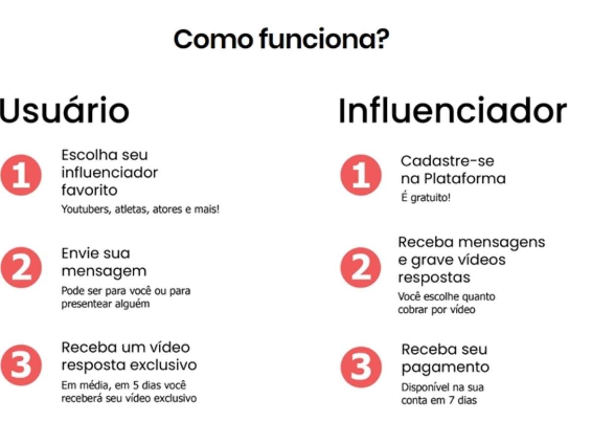 Caso queira um vídeo personalizado, gravado por um influenciador digital para si ou para presentear alguém, através da plataforma, é possível enviar uma mensagem para a celebridade e receber um vídeo exclusivo, baseado na mensagem que enviou.