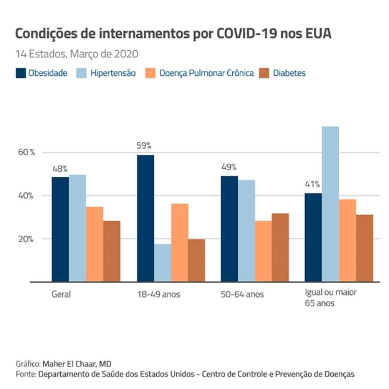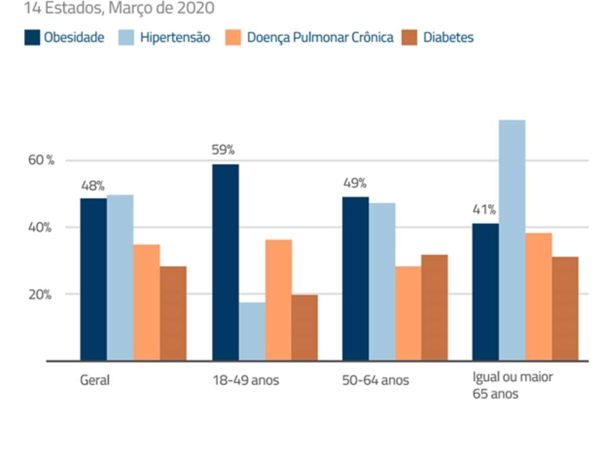 Para aproximadamente 180 adultos hospitalizados 89,3% apresentavam outras doenças crônicas, sendo as mais comumente relatados a hipertensão (49,7%), obesidade (48,3%), doença pulmonar crônica (34,6%), diabetes mellitus (28,3%) e doença cardiovascular (27,8%). Entre jovens e adultos internados, com idades entre 18 e 49 anos, 59% são obesos. Na faixa etária entre 50 e 64 anos, o número de obesos nos leitos é de 49%. Apenas entre idosos, com idade igual ou superior a 65 anos, a obesidade é superada pelos casos em que pacientes apresentam histórico clínico de hipertensão arterial.
