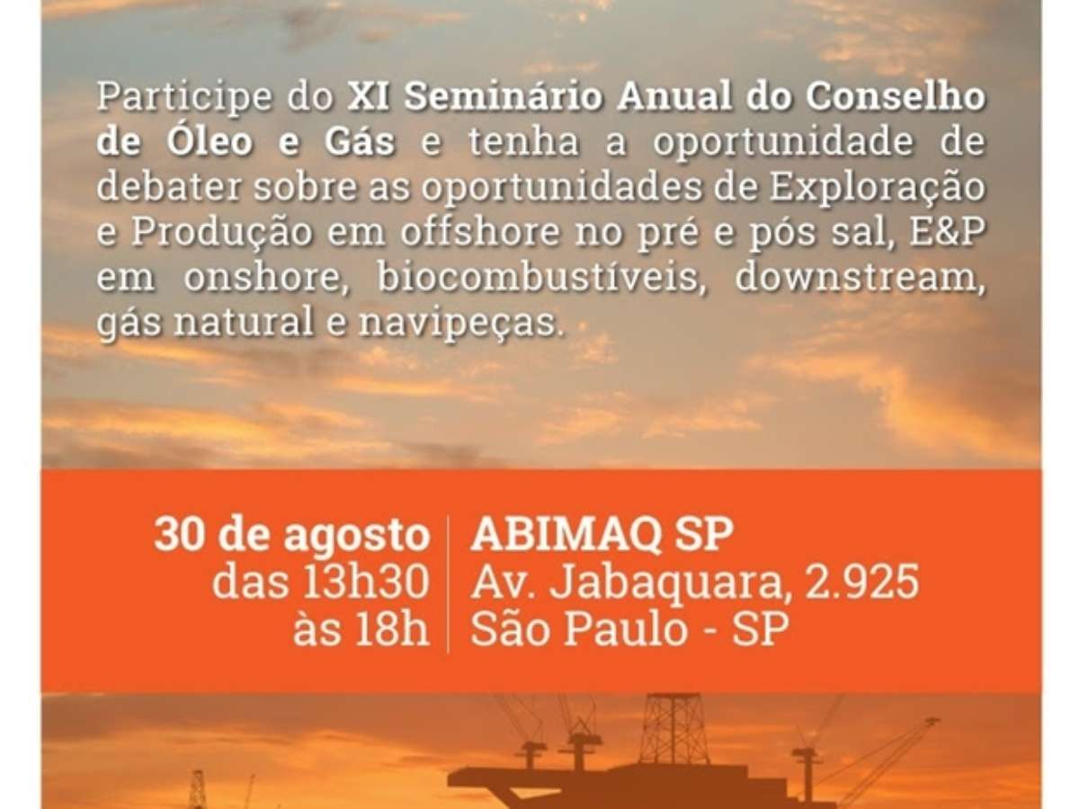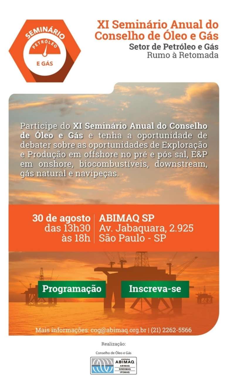 O Conselho de Óleo e Gás da Associação Brasileira da Indústria de Máquinas e Equipamentos (ABIMAQ) promoverá o seminário 'Setor de Petróleo e Gás - Rumo à Retomada', no dia 30 de agosto, a partir das 13h30, em São Paulo.