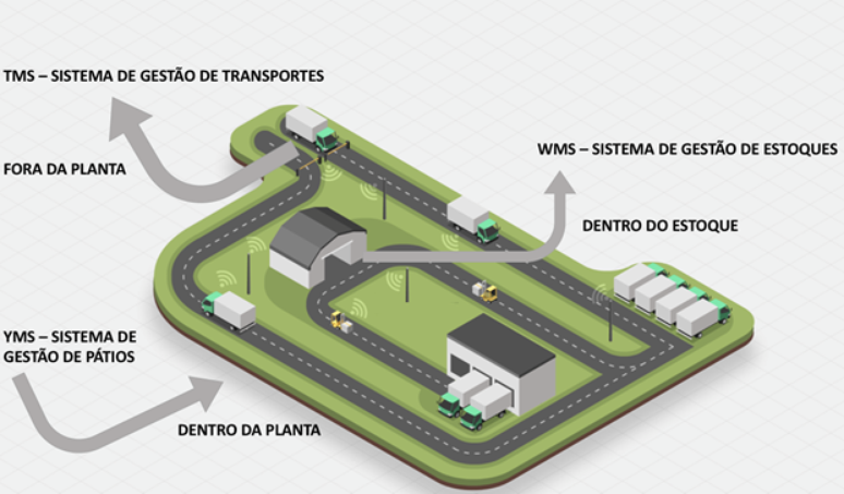 Ilustrando: o WMS "enxerga e controla" dentro do estoque, o TMS controla e gerencia da porta da rua para fora e o YMS tem a função de gerir o espaço entre a porta de entra e porta de saída passando pelas balanças, docas e portaria. O módulo de agendamento pode fazer parte de qualquer um deles.