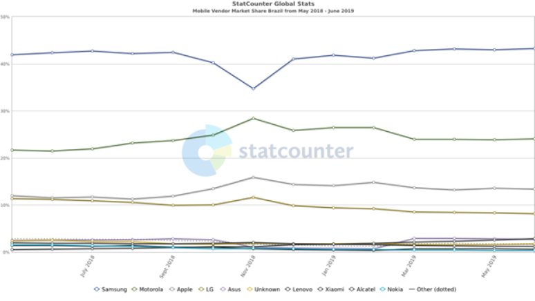 Segundo dados da Statcounter de junho de 2019, a chinesa Xiaomi já detém 7,39% de todo o mercado mundial de celulares, ficando atrás apenas da Samsung (31,98%), Apple (22,04%) e da também chinesa, Huawei (9,04%).