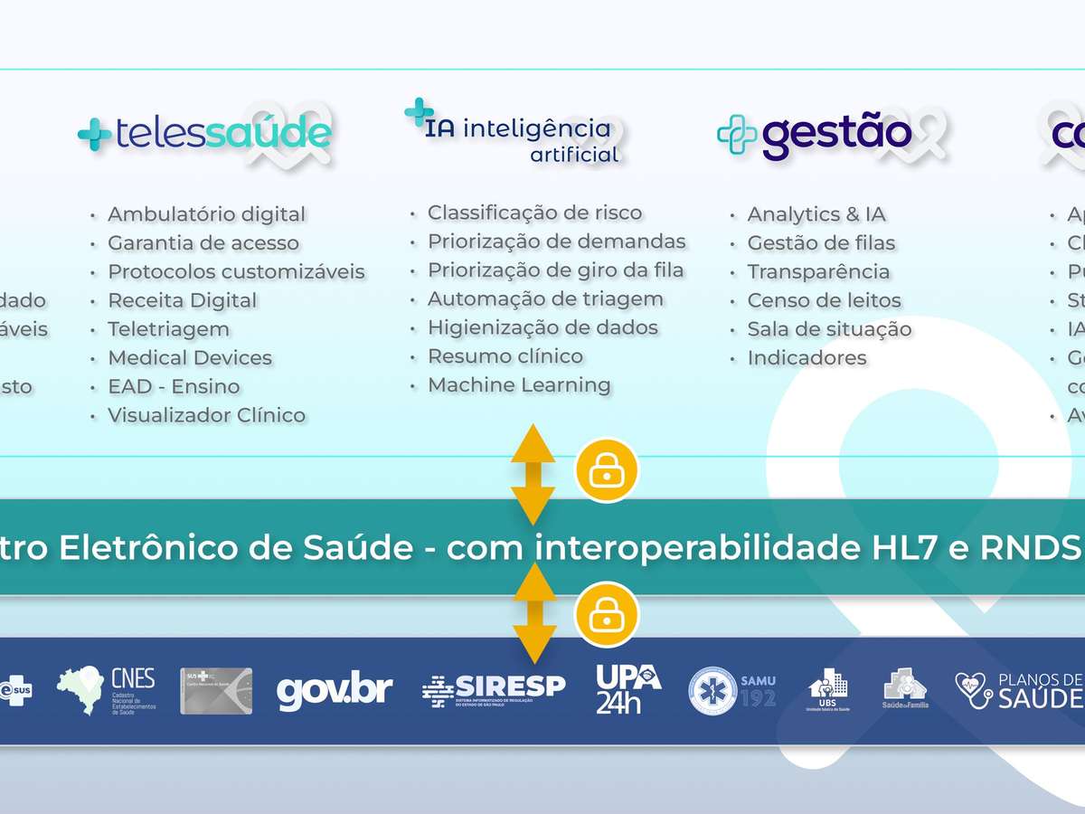 Entre seus recursos, o sistema concentra o histórico do paciente em um RES centralizado e interoperável, capaz de se integrar a bases como TISS, Saúde@SUS, CNES, SIRESP, UPA 24h, SAMU 192, HÓRUS e Medex.