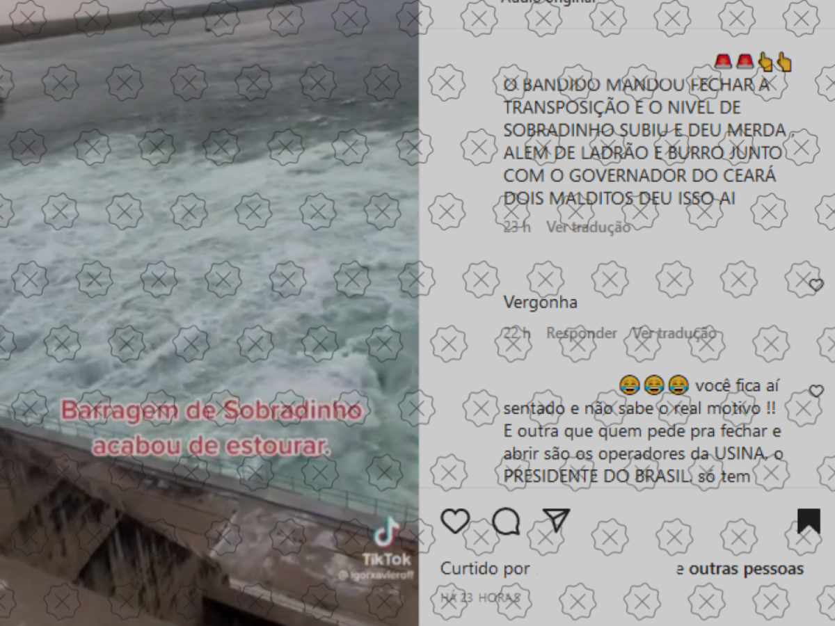 São mentirosas as alegações feitas em vídeo que viralizou nas redes sociais de que a barragem da Usina Hidrelétrica de Sobradinho, na Bahia, teria se rompido depois de Lula ter mandado "fechar a transposição" do rio São Francisco. De acordo com a Chesf, responsável pela usina, o vídeo mostra apenas uma comporta da barragem aberta, em atividade rotineira.
