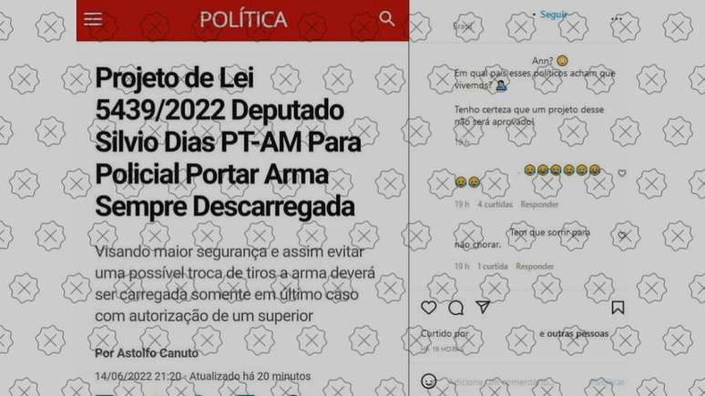 Não é verdade que um deputado federal do PT propôs um projeto de lei para determinar que policiais portem armas descarregadas, como afirmam publicações nas redes sociais (veja aqui). O parlamentar citado, Silvio Dias, não existe, tampouco um projeto com o número 5.439/2022. As postagens também simulam o design do G1, mas o site nunca publicou notícia semelhante.