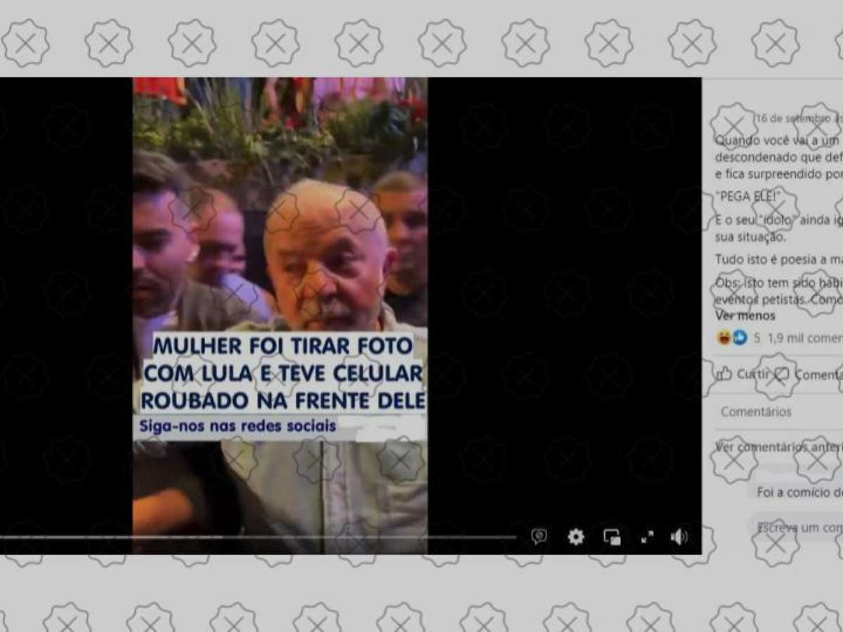 Um vídeo circula nas redes sociais com a afirmação enganosa de que uma mulher teve o celular roubado na frente do ex-presidente Luiz Inácio Lula da Silva (PT) na quinta-feira (15), em Montes Claros (MG). No vídeo, o servidor público Diego Paraíso, que leva uma criança nos ombros, tem o celular retirado por uma outra pessoa, mas ele nega que tenha sido roubado, pois o aparelho foi devolvido posteriormente.