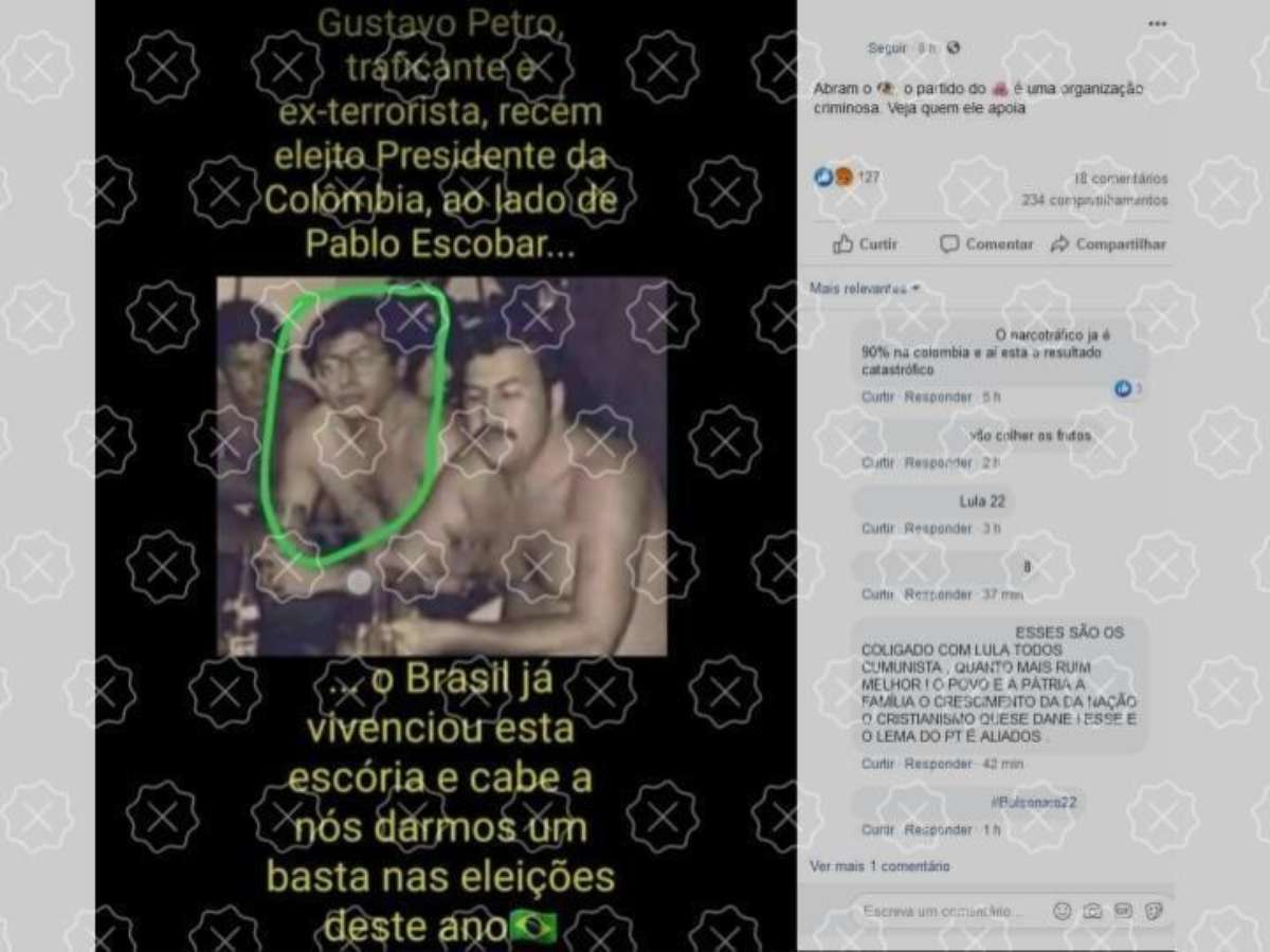 A imagem do rosto de Petro foi retirada de uma foto em que ele aparece ao lado do ex-presidente venezuelano Hugo Chávez (1954-2013), em julho de 1994, em Bogotá. A mesma imagem aparece em sites como o La Silla Vacía e Pacifista como um registro feito pela rede colombiana de notícias Colprensa.