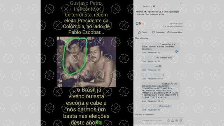 Publicações nas redes sociais compartilham uma imagem em que o rosto do presidente eleito da Colômbia, Gustavo Petro, foi inserido digitalmente sobre o de um homem sem camisa, não identificado, que está sentado ao lado do traficante colombiano Pablo Escobar, morto em 1993. A foto original foi publicada por Jhon Jairo Velásquez Vásquez, em seu perfil no Facebook (veja abaixo).