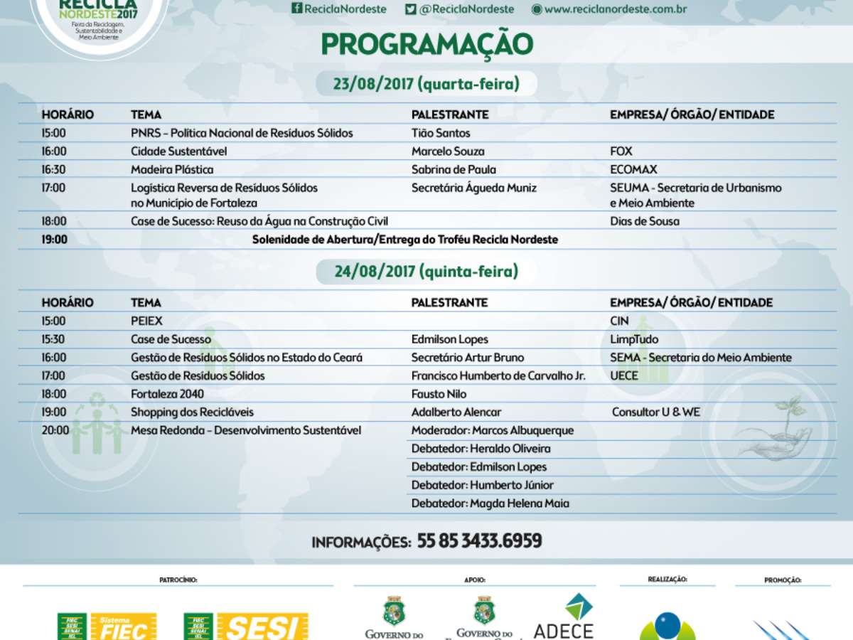 Além disso, a Recicla Nordeste realiza, em sua solenidade de abertura, a entrega do Troféu Recicla Nordeste, conferido a três personalidades que fazem a diferença no setor da sustentabilidade no estado do Ceará. Nesta edição, serão homenageados o prefeito de Fortaleza, Roberto Cláudio, e os empresários Ricardo Cavalcante e João Carlos Paes Mendonça.