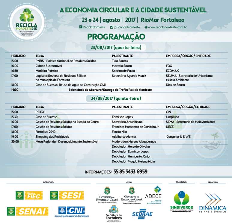 O símbolo da reciclagem é formado por três setas, fazendo referência a um ciclo: a primeira seta representa a indústria, que fabrica um produto; a segunda faz menção ao consumidor, que consome este produto; a terceira seta representa o retorno do produto ao ciclo produtivo, revalorizado por meio da reciclagem. Esse deveria ser o ciclo natural de todo produto, mas ainda está longe de ser uma grande realidade. Atualmente, 250 mil toneladas de lixo são produzidos no Brasil, mas dos 30% que poderiam ser reaproveitados desse material, apenas 3% são destinados à reciclagem, o que representa uma grande perda, já que R$ 200 milhões poderiam ser gerados com o aumento da reciclagem de resíduos somente no estado do Ceará, segundo o Sindicato das Empresas de Reciclagem de Resíduos Sólidos Domésticos e Industriais no Estado Do Ceará - SINDIVERDE-CE. Visando mostrar essa realidade e as oportunidades de negócio que giram em torno dela, a Dinâmica Feiras e Eventos e o SINDIVERDE-CE realizam a 7ª edição da Feira Recicla Nordeste - Feira da Reciclagem, Sustentabilidade e Meio Ambiente nos dias 23 e 24 de agosto, no Shopping RioMar Fortaleza (R. Des. Lauro Nogueira, 1500 - Papicu). O acesso ao evento é gratuito e são esperados cerca de 2 mil visitantes.