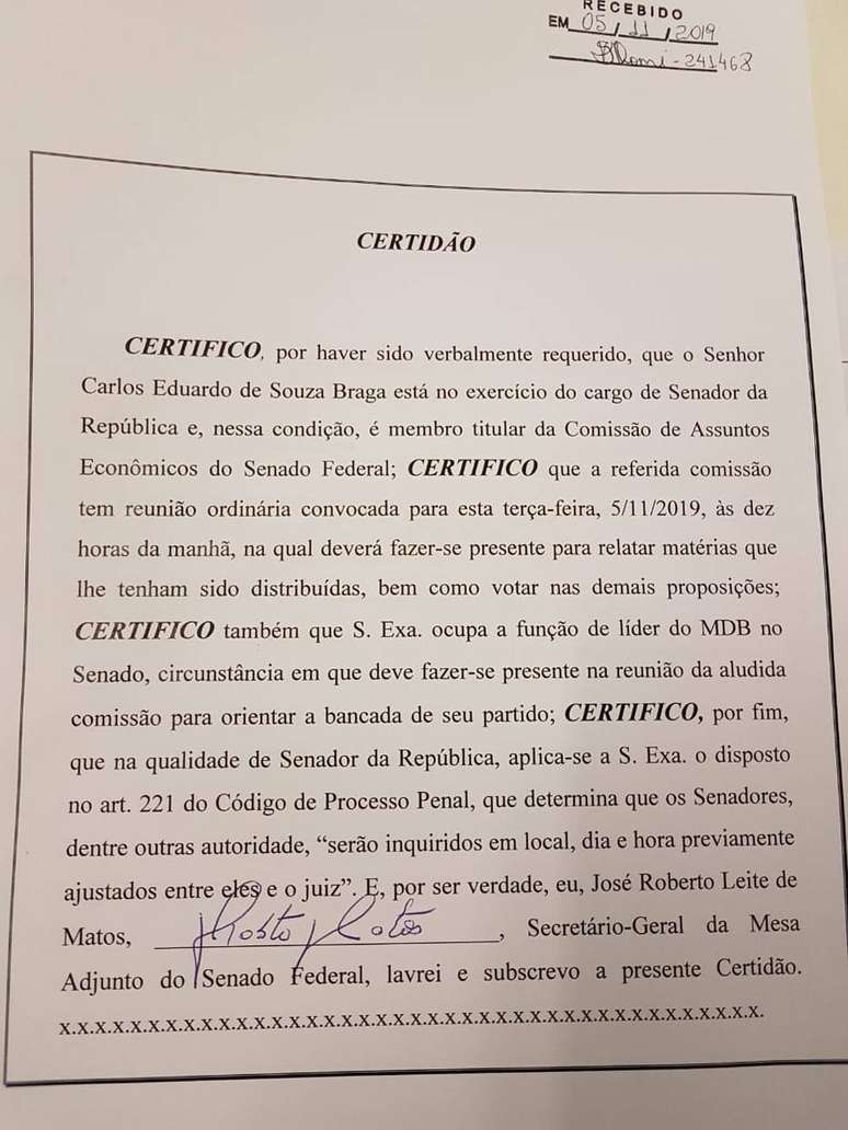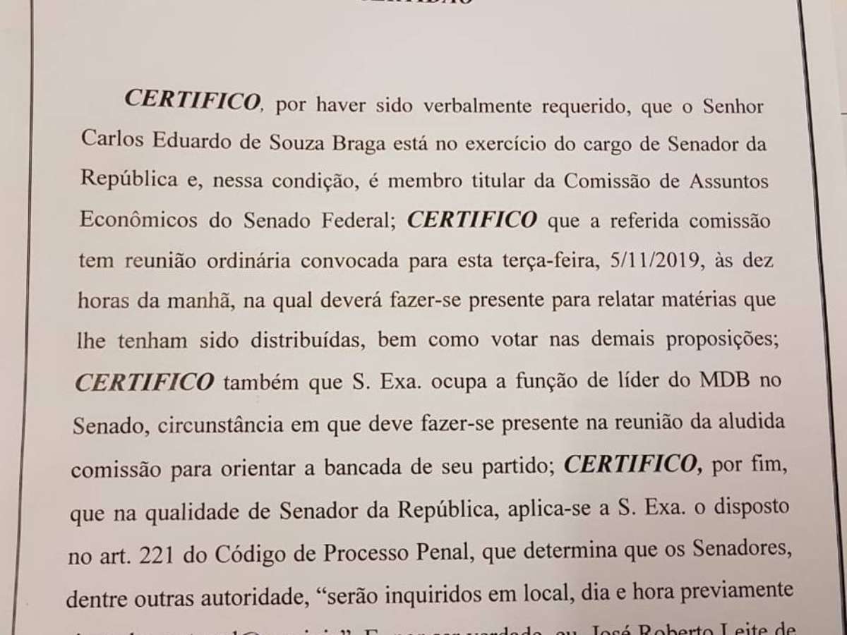 Após a reunião com Onyx, a assessoria de Braga também divulgou um documento assinado pelo secretário-geral adjunto da Mesa do Senado, José Roberto Leite Matos, em que certifica a participação do senador na Comissão de Assuntos Econômicos. O colegiado tinha reunião marcada na manhã desta terça-feira, também às 10h, mesmo horário da oitiva na PF e do encontro com Onyx.