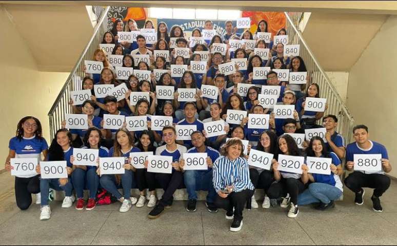 No dia 10 de fevereiro, Ione e parte de seus alunos organizaram-se na escadaria da escola para serem fotografados. Na imagem, 61 estudantes sorriem e seguram a nota que alcançaram na redação do Enem 2022, que variam entre 700 e 980. A exceção, relata a professora, foram os alunos que tiraram 680 pontos, mas mesmo estes conquistaram boas vagas nas universidades somando o desempenho em outras disciplinas do exame. Na edição passada, 26 de seus estudantes tiraram mais de 900 pontos na redação, um feito alcançado por apenas 5% dos candiadtos.