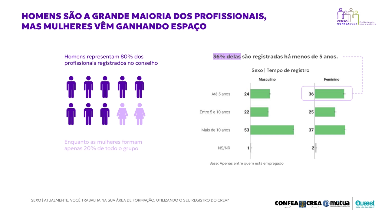 A pesquisa também aponta para a transformação e inclusão de gênero, raça e regionalidade na área tecnológica. Mulheres vêm ganhando espaço de atuação já que, de acordo com a pesquisa, 36% das entrevistadas estão registradas no Confea há menos de cinco anos. Além disso, elas são jovens, representando um terço dos profissionais registrados com menos de 30 anos.