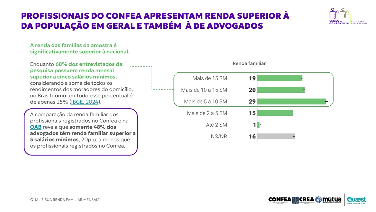 Para termos uma referência, a comparação entre a renda familiar dos profissionais registrados no Confea e na Ordem dos Advogados do Brasil (OAB), verifica-se que somente 48% dos advogados têm renda superior a 5 salários mínimos, mostrando que, dentre os profissionais registrados em ambas as entidades, 20% dos engenheiros possuem remuneração maior do que os advogados.