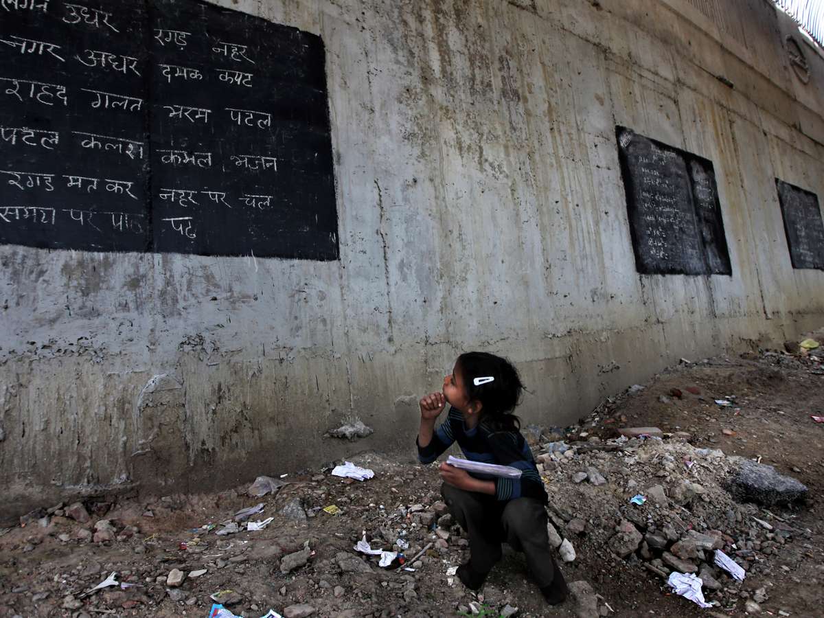Professores utilizam quadros-negros improvisados para ensinar seus pupilos em uma escola a céu aberto em Nova Délhi, na Índia. O país prometeu ensino compulsório a todas as crianças entre 6 e 14 anos - o que deveria entrar plenamente em vigor até o dia 31 de março -, porém milhões de indianos ainda não vão ao colégio. Moradores de favelas e áreas carentes da capital indiana frequentam o local, onde têm aulas gratuitamente