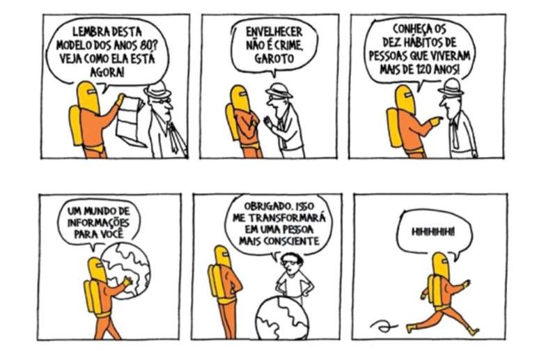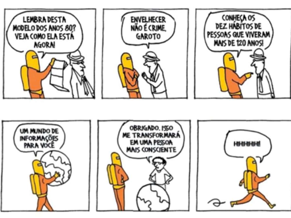 O primeiro texto de apoio problematizava o funcionamento dos algoritmos. Um personagem incorporava as características da tecnologia e parecia direcionar o comportamento das pessoas. Veja abaixo: