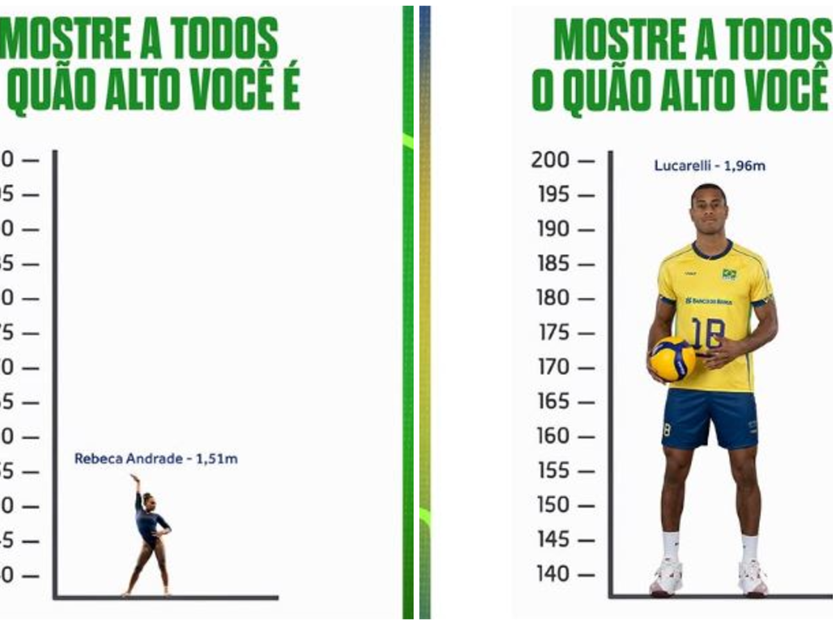 A trend "Mostre a todos o quão alto você é" viralizou nas redes sociais nos últimos dias e até o Comitê Olímpico do Brasil entrou na brincadeira. A trend envolve mostrar a altura de uma pessoa dentro de um gráfico em que o eixo y (vertical) marca os centímetros e, depois, comparar com outros indivíduos. O COB, por exemplo, fez publicações da altura de atletas como Caio Bonfim, Lucarelli e Rebeca Andrade.