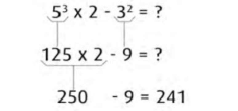 Quando, em uma expressão aritmética, aparecem potências, elas devem ser resolvidas primeiro. Depois, seguimos resolvendo as multiplicações, divisões e, por último, as adições e subtrações.