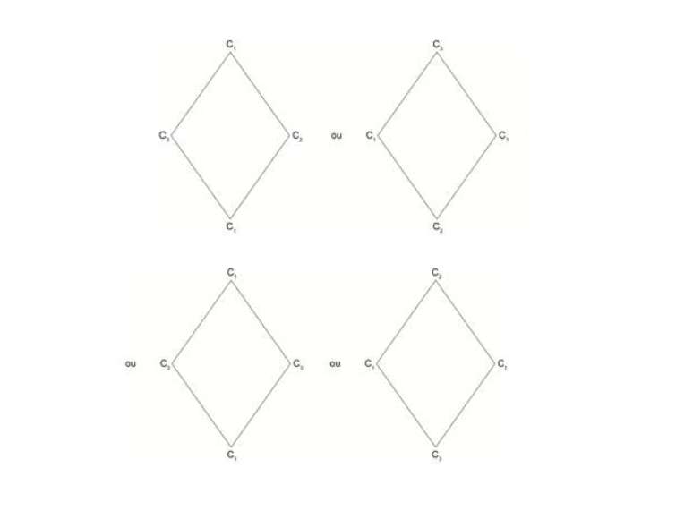 Caso 3: Usando todas as cores de pedras possíveis, sendo os vértices A e C de cores diferentes e B e D de cores iguais temos três possibilidades no total, considerando que joias simétricas são iguais.