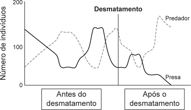 30Nos estados do Tocantins e do Maranhão, a taxa dedesmatamento chegou a 68,3% em 2000, segundo aONG WWF Brasil. A supressão da floresta pode causardesequilíbrios entre populações de presas e de predadores.O gráfico relaciona o crescimento populacional de umaespécie de presa e o de uma espécie de predador em umdeterminado sistema.