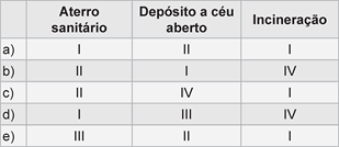 45Dois dos grandes responsáveis pela poluição são oacúmulo de lixo sólido e a disposição dele. Há váriosprocessos para a disposição do lixo, dentre eles o aterrosanitário, o depósito a céu aberto e a incineração. Cadaum deles apresenta vantagens e desvantagens.Considere as seguintes vantagens de métodos dedisposição do lixo:
