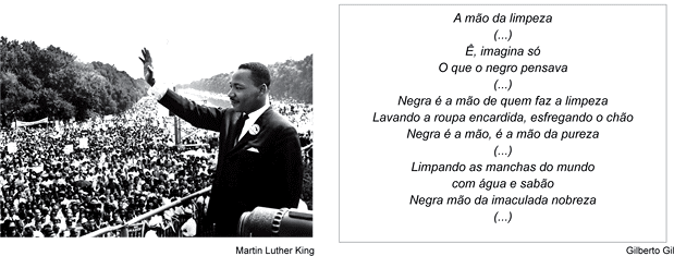 A luta dos negros pela igualdade de direitos contou, nos Estados Unidos, nas décadas de 1950 e 1960, com a liderança dopacifista Martin Luther King. No Brasil, por meio de sua música, Gilberto Gil é uma das vozes que denunciam as condiçõesprecárias de vida de parcela dessa população. O processo histórico que deu origem à exclusão social de parte considerável dapopulação negra, tanto no caso norte-americano quanto no brasileiro, e uma de suas consequências estão relacionados em: