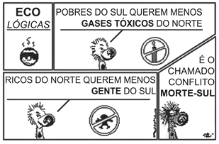 e) evidencia um antagonismo entre ricos e pobres, num conflito onde a população pobre dos países do Sul é dominada pelo poder ideológico e econômico do Norte.