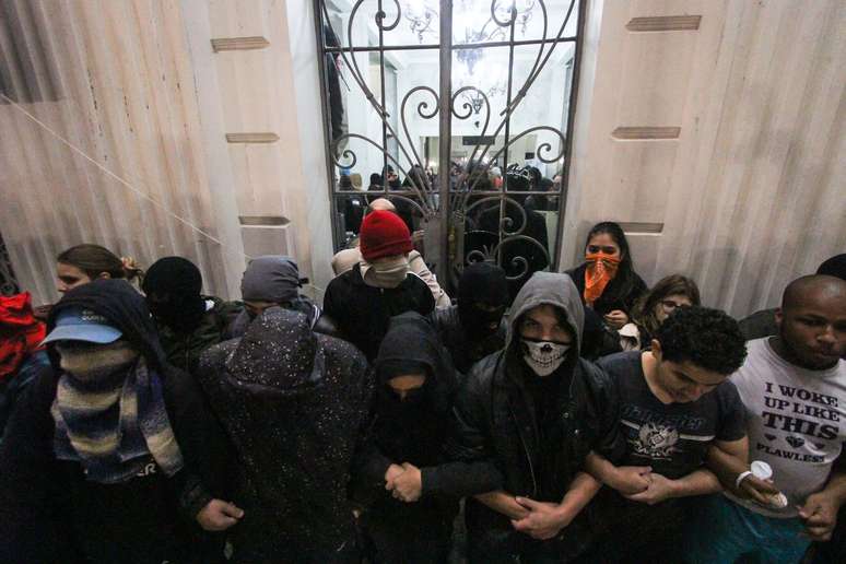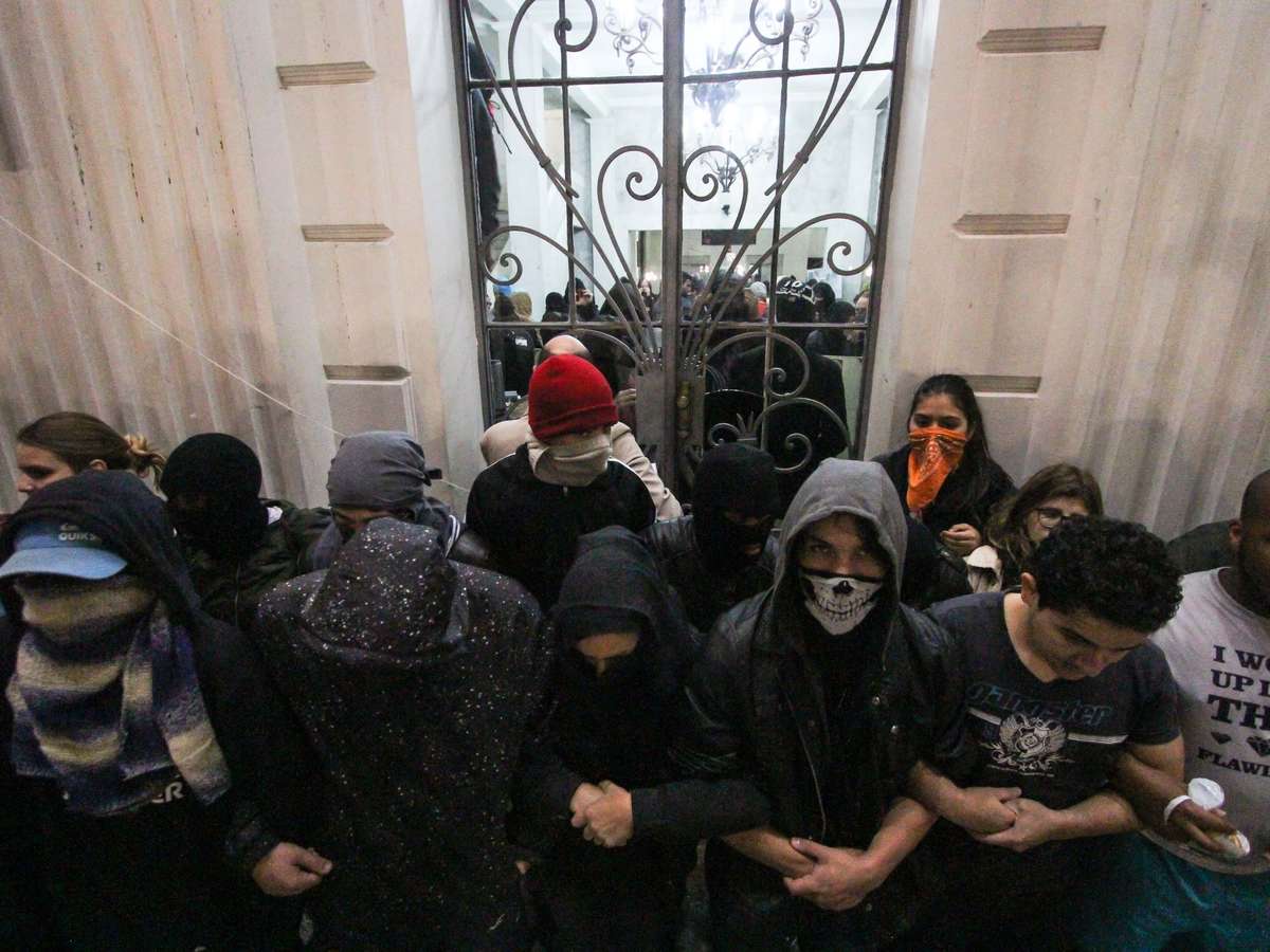 Vídeos postados nas redes sociais mostram vidros sendo quebrados e empurrões entre pessoas favoráveis e contrárias à tomada do prédio. Estudantes e docentes relataram que foram mantidos do lado de dentro por cerca de meia hora, mesmo contra vontade. Os manifestantes estavam mascarados e empunhavam uma bandeira nas cores vermelha e preta, dividida diagonalmente, em partes iguais, e identificada como sendo de uma organização antifascista. Um sofá foi colocado contra a porta de entrada para impedir que se veja o que acontece de dentro.