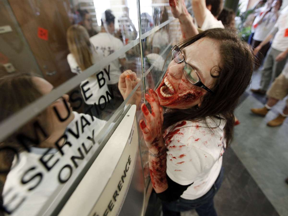 Estudantes fantasiados participaram da simulação de um ataque zumbi durante um exercício promovido pela Universidade de Michigan, nos Estados Unidos. A atividade foi proposto aos alunos da Escola de Saúde Pública a fim de prepará-los para agir de maneira apropriada na eventualidade de uma situação de desastre ou emergência - não necessariamente um apocalipse zumbi