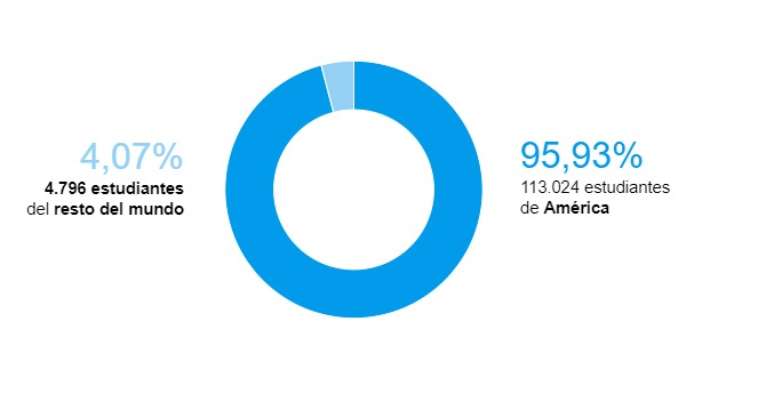 Esse número representa 4,3% do corpo discente universitário do país, que soma mais de 2,7 milhões de alunos. Um aspecto que chama atenção é a maioria absoluta de cidadãos provenientes das Américas, representando 95,9% dos estudantes estrangeiros. Veja o gráfico: