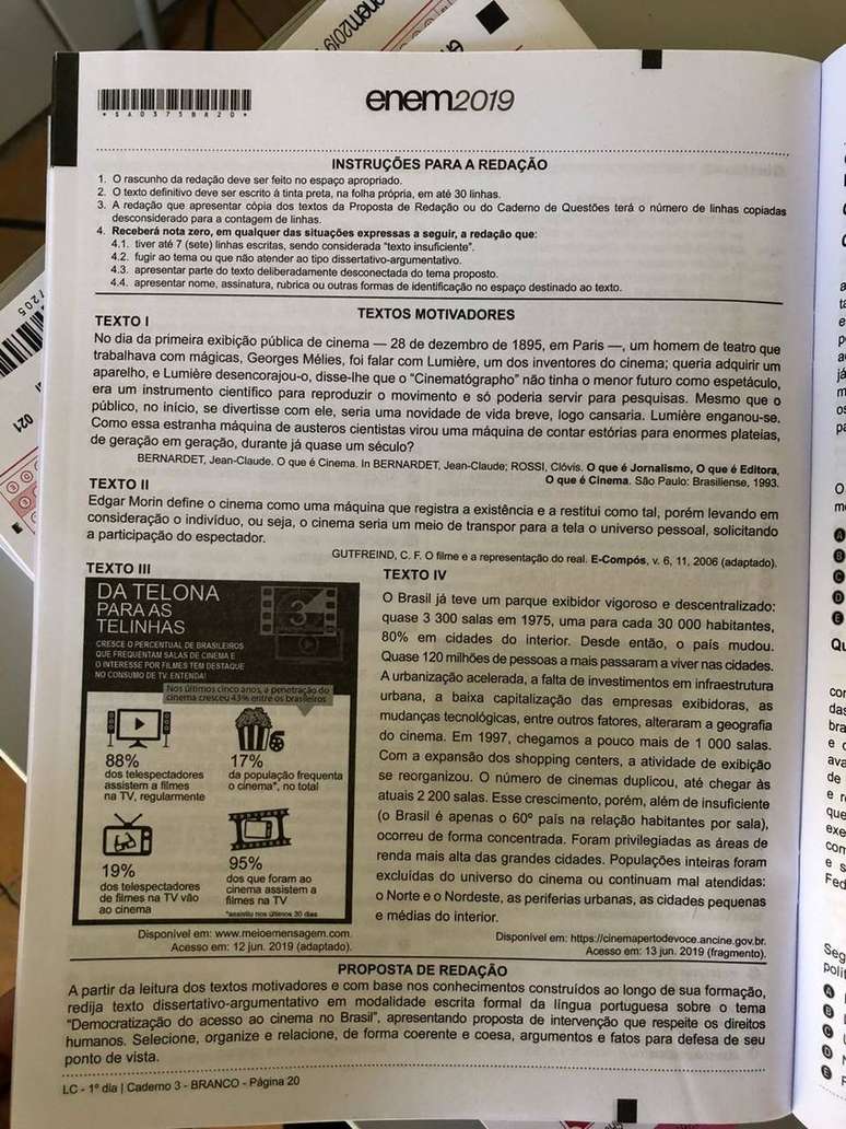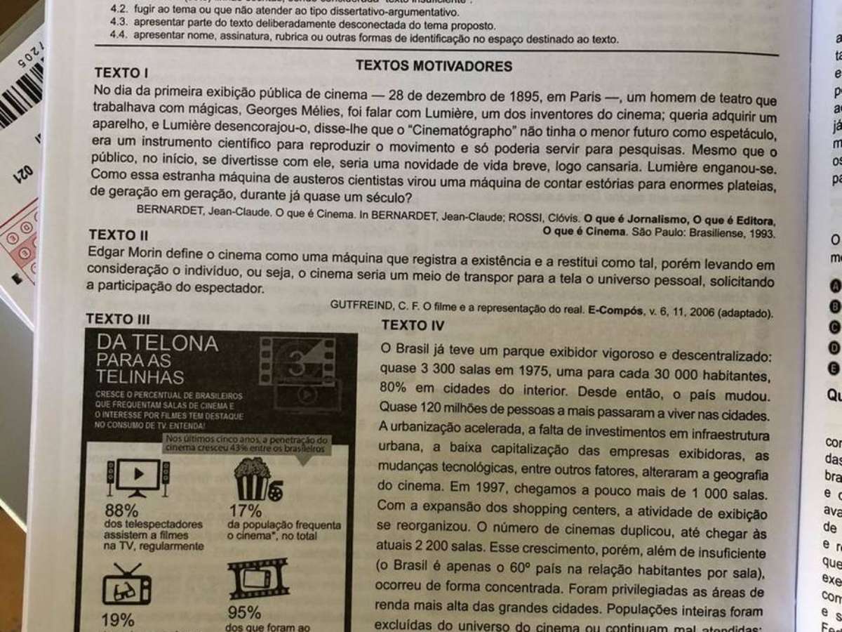 No último domingo, minutos após o início do Enem, já circulava nas redes sociais a imagem da página com a proposta da Redação, que abordou a democratização do acesso ao cinema. A Polícia Federal investiga o caso.