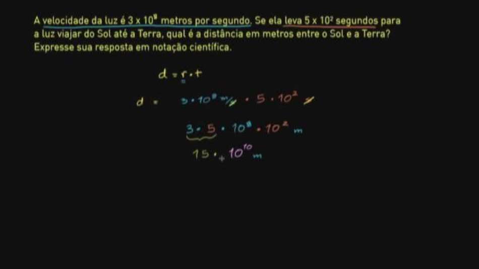 Este vídeo calcula a distância entre o Sol e a Terra, utilizando a velocidade da luz e o tempo que a luz leva para chegar à Terra, escrevendo a resposta em notação científica.