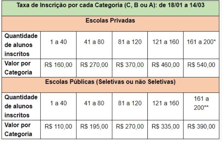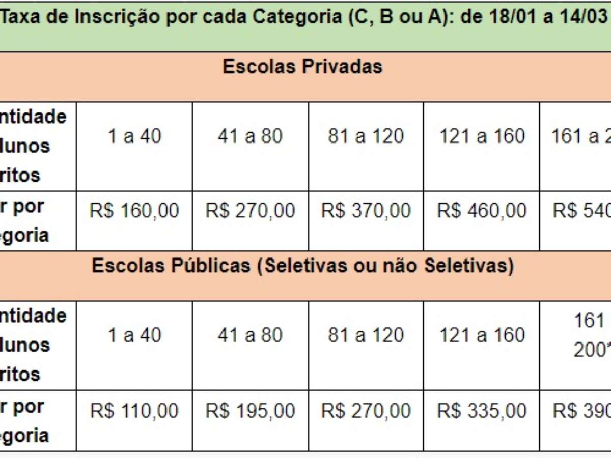 A escola pode inscrever alunos em três categorias, são elas: