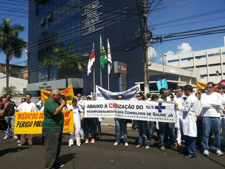 Os médicos se reuniram no Largo de São Sebastião, no centro da capital, e de lá saíram em passeata até a sede da Fieam, na avenida Joaquim Nabuco, também na área central.