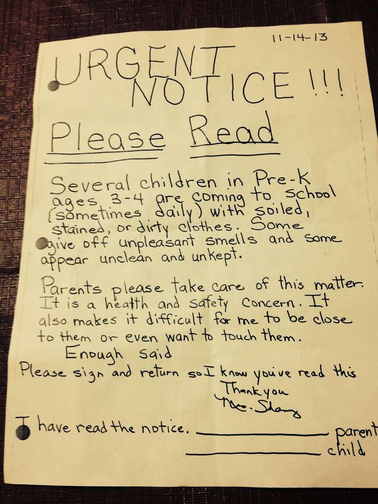 Pais e funcionários de uma escola na cidade americana de Buffalo, no Estado de Nova York, estão reclamando de uma professora que enviou uma carta criticando "o fedor e a sujeira" de crianças durante as aulas. A professora Sharon D.Perry Dunnigan acusou diversos estudantes de irem à pré-escola com roupas sujas ou manchadas, e alegou que isso torna difícil para ela "se aproximar ou mesmo querer tocá-las". A carta, enviada aos pais em meados de novembro, afirmou que essa questão é um problema de saúde e segurança. As informações são do Huffington Post.